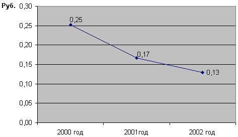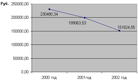 Рис.2.1.3. Изменение фондоотдачи за 2000-2002 гг. В результате увеличения объема реализации в 2001 году по сравнению с 2000 годом произошло снижение фондоемкости на 0,08 рубля, т.е. на 34%. В результате увеличения объема реализации в 2002 году по сравнению с 2001 годом наблюдается снижение фондоемкости на 0,04 рубля, т.е. на 21,9 %, а по сравнению с 2000 годом фондоемкость снизилась на 12 копеек или на 48,4 %. На рисунке приведен пример изменения фондоемкости за 2000-2001 гг.