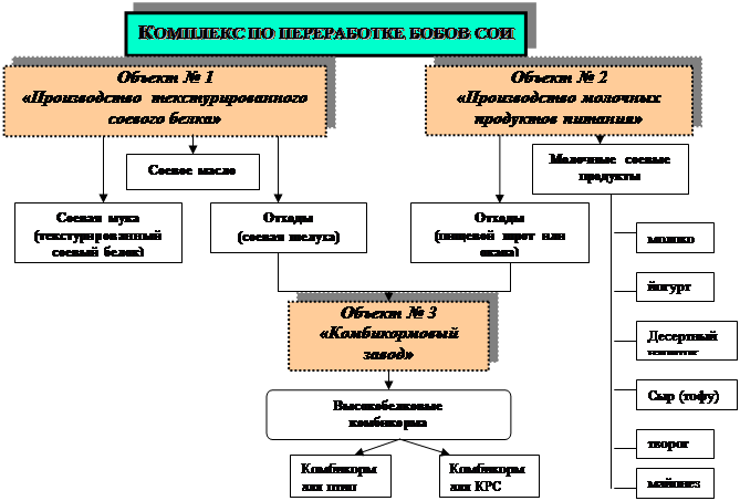 Рисунок 1 “Комплекс по переработке бобов сои”........................................................................................................ 17 Настоящий бизнес-план представляет Закрытое акционерное общество «СПС» с целью привлечения инвестиционных средств, позволяющих реализовать проект создания в г. Исилькуль (Омская область) производства по переработке бобов сои. Главной целью данного проекта является обеспечение здоровыми высокобелковыми диетическими продуктами питания из бобов сои Сибири и Северо-восточного Казахстана. В рамках реализации проекта предполагается строительство мощного комплекса по переработке соевых зерен, который включает в себя три самостоятельных производственных объекта. Все производственные объекты сведены в единую технологическую цепочку, в основе которой лежит безотходная технология использования свойств сои. Объект 1 «Производство текстурированного растительного белка из бобов сои» предполагает использование экологически чистой технологии переработки бобов сои, основанной на процессе термопластической экструзии. Технология сухой экструзии, положенная в основу планируемого производства, запатентована компанией INSTRA-PRO International (США) в 1969 году и применяется более чем в 90 странах мира. Целью строительства данного объекта является обеспечение рынка страны и ближнего зарубежья качественными, сбалансированными по белку пищевыми продуктами (соевой мукой и текстуратом соевого белка), стоимость которых в 2-3 раза ниже, чем стоимость основных продуктов питания, содержащих белок (мясо, птица, молоко и т.д.). Также соевая мука и текстурированный соевый белок, входя в состав других продуктов питания, таких как колбасные изделия, сыры, хлебобулочные и кондитерские изделия, позволяют снизить себестоимость и повысить диетические свойства последних. Объект 2 «Производство соевых молочных продуктов питания» предполагает технологию переработки бобов сои на основе установки «Агролактор» путем экстракции белковой суспензии с последующей переработкой его в молочные продукты. Целью данной программы является обеспечение рынка региона качественными, обладающими уникальными диетическими свойствами, с высоким содержанием белка соевыми молочными и кисломолочными продуктами питания (молоко, йогурт, творог, сыр, майонез и т.п.), которые по вкусовым качествам не уступают, а по дешевизне превосходят их аналоги на животной основе. Объект 3 «Комбикормовый завод» основан на использовании в качестве сырья отходов объекта 1 (соевую шелуху) и объекта 2 (окару) для производства высококачественных белковых комбинированных смесей для развития и поддержания жизнеспособности животноводческих и птицеводческих агрокомплексов Сибири и Казахстана. Реализация предлагаемого проекта полностью соответствует Федеральной программе по производству и переработке сои, принятой Постановлением Правительства Российской Федерации от 23.02.1993 г. №146, и способствует решению поставленных в ней задач. Также успешная реализация проекта обеспечивается полученной поддержкой и заинтересованностью инициаторов проекта, чей статус и надежная деловая репутация является фундаментом для такого масштабного проекта: Научные исследования последних лет показали, что постоянное употребление в пищу продуктов переработки соевых бобов приводит к частичному выведению из о