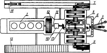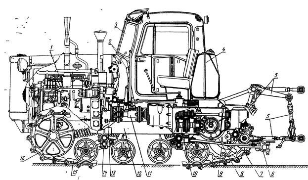 Мал. 2. Розташування механізмів деяких складальних одиниць та деталей на гусеничному тракторі ДТ-75: 1—двигун, 2— важелі управління; 3—кабіна, 4—паливний бак, 5 — гідравлічна навісна система; би—причіпний пристрій; 7 — ведуче колесо (зірочка), 8 —планетарний механізм 9 — кінцева передача 10 — коробка передач, 11— з'єднувальний вал, 12 - рама; 13 — зчеплення; 14 - передня каретка підвіски з опорними катками, 15 — гусеничний ланцюг; 16 — направляюче колесо Механізми трактора можна розділити на наступні основні групи: двигун, трансмісія (силова передача), ходова частина, механізми управління, робоче і допоміжне обладнання. Розташування основних механізмів гусеничного трактора (на прикладі трактора ДТ-75) показане на малюнку. У двигуні 1 відбувається перетворення хімічної енергії згоряючого в його циліндрах палива в механічну енергію. Трансмісія — це сукупність окремих механізмів, що передають момент двигуна, що крутить ведучим колесам і що змінюють його і частоту обертання ведучих коліс по величині і напряму. Трансмісія складається із зчеплення 13, з'єднувального вала 11, коробки передач 10, головної передачі 17 і кінцевих передач 9. Ходова частина служить для перетворення обертального руху ведучих коліс в поступальний рух трактора. У неї входять рама 12, ведучі колеса (зірочки) 7, гусеничні ланцюги 15, каретки 14 підвіски, що направляють колеса 16 і підтримуючі ролики. За допомогою ведучих коліс і опорних катків підвісок трактор перекочується по гусеничних ланцюгах, що складаються з шарнірно сполучених стальних ланок. Механізми управління, впливаючи на ходову частину, змінюють напрям руху трактора, зупиняють і утримують його в нерухомому положенні. До них відносяться механізм повороту 8 (планетарний) і гальма. Двигун, механізми трансмісії і ходової частини трактора кріпляться на рамі (кістяку) 12.