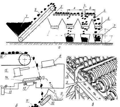 Мал. 6. Роликова сортувалка (а, в) і автоматичний віддільник домішок (б): I — бункер; 2, 6,9 и // — транспортери; 3 — диски; 4 — ролики; 5 — збірники; 7 — контейнери; 8 — приймач; Ю — гірка; 12 — механізм приводу; 13 — компресор; 14 — толкатель; 15 — генератор рентгенівських променів; 16 — канальна стрічка. Роликова сортувалка КСЭ-15Б розділяє бульби на фракції по розмірах. Поверхня сортувалки (мал. XIV. 5, а} складена з обрезинених фігурних роликів, що обертаються 4. На дільниці А ролики утворять осередки шириною (по ходу продукту) 45 мм, на дільниці Б — 55 мм. Для виділення домішок і бульб масою до 30 г перед фігурними роликами вміщений сепаратор, складений з п'яти дискових батарей. Диски 3 сепаратора, виготовлені з волокнита, змонтовані на валах. Вали з дисками і роликами розташовані паралельно і обертаються в одному напрямі. Під роликами встановлені збірники 5 з транспортерами 6 для відведення бульб і домішок. Бульби завантажують в бункер 7, з якого транспортером 2 подають на дискового сепаратора. Бульби перекочуються по дисках, а домішки прокидаються в просвіти між ними. Далі бульби переміщуються, роликами 4 і, западаючи в осередки (на дільниці А — дрібні бульби, на дільниці 5 —середні), проходять вниз. Великі бульби сходять по роликовій поверхні. Транспортерами 6 бульби завантажують в контейнери 7. Ролики можна розсовувати, збільшуючи або зменшуючи розмір прохідних осередків. Якщо у висхідному матеріалі міститься багато дрібних бульб, розсовують ролики А, коли переважають середні бульби, розсовують ролики Б. Переборочні столи являють собою стрічкові транспортери, з обох сторін яких обладнані місця для робітників. Робітники оглядають потік бульб і відбирають вручну грудки, камені і зіпсовані бульби. Переборочні столи встановлюють на стаціонарних картоплесортирувальних пунктах. Пересувний картоплесортирувальний пункт КСП-15Б застосовують для потокової доочистки картоплі від домішок, сортування бульб на три фракції і завантаження відсортованої картоплі в сховищі, мішки, кошики, -контейнери або транспортні засоби. Механізми пункту КСП-15Б можуть приводитися від двигуна внутрішнього згоряння потужністю 3,5 кВт, електродвигуна потужністю 2,8 кВт або вала відбору потужності трактора. Тому його можна встановлювати в полі і у сховищ. Стаціонарний картоплесортирувальний пункт ЦСП-50 призначений для післяуборочної обробки картоплі в спеціалізованих господарствах. Пункт складений з двох приймальних бункерів ПБК-4 (місткістю 10 м3 кожний), двох високопродуктивних картоплесортировок КС-40, переборочних столів СПУ-15, бункерів-накопичувачів для великої і середньої фракцій і системи транспортерів для переміщення бульб і домішок. Обладнання пункту встановлюють під дахом, що гарантує його роботу незалежно від погодних умов. Пункт забезпечує прийом і доочистку бульб, прибраних комбайнами, від домішок, сортування бульб на три фракції, перегородку відсортованих середніх і великих бульб, подачу їх в бункер-накопичувач і завантаження транспортних засобів. Продуктивність пункту до 50 т/ч. 210. На якій передачі повинен рухатись трактор Т-25 при обприскуванні 8 рядків кукурудзи, якщо норма витрат ядохімікатів 80 кг/га, а щохвилинні витрати через 1 розпилювач 0,5 л/хв.? Швидкість руху трактора Т-25 знайдемо по формулі: v = g * 600 / Q * B, де Q – норма витрати робочої рідини, B – ширина зах