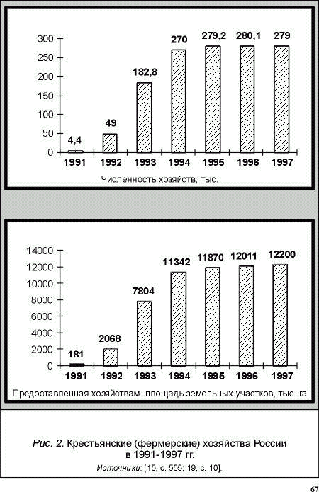 По состоянию на 1 января 1997 г. в России насчитывалось 279 тыс. фермерских хозяйств с площадью земли 12,2 млн. га (в среднем по 44 га на хозяйство) против 280 тыс. на 1 января 1996 г. Сельхозугодья в фермерских хозяйствах занимают 11,3 млн. га (93% отведенных им земель), в том числе пашня – 8,3 млн. га (68%). На долю фермеров приходилось 5,3% сельхозугодий страны и 6,3% пашни. Более половины фермеров имели по 20 га и менее, пятая часть – по 21–50 га и только 9% хозяйств – свыше 100 га земли[20]. Доля фермерских хозяйств в производстве продукции отрасли стабильно низкая и не превышает 2%. Еще в 1991 г., анализируя необходимые и реальные условия для развития фермерских хозяйств в стране, нами был сделан вывод о преждевременности сплошной “деколлективизации”. Исходя из состояния общественного сознания, уровня развития промышленного потенциала, разработанности нормативной базы, особенностей социально-политической ситуации в стране и с учетом длительности процесса становления рыночных отношений мы пришли к заключению о том, что фермерские хозяйства в обозримой перспективе не смогут стать господствующей формой сельскохозяйственного производства в российской деревне. С уверенностью можно было говорить лишь об имеющихся предпосылках для становления многоукладной аграрной экономики, одним из секторов которой мог бы стать фермерский сектор [7]. Эти прогнозы оправдались. Глава 3. Парадоксы аграрной реформыДинамика развития трех сегментов аграрной экономики (коллективные, фермерские, личные подсобные хозяйства) ярко показывает первый парадокс аграрной реформы, проявившийся в экспансии мелкотоварного производства. Вопреки намерениям реформаторов ведущими секторами сельскохозяйственного производства стали не фермерские хозяйства и не акционированные коллективные хозяйства, а личные подсобные хозяйства сельских жителей. Не имея никаких средств механизации, отчасти в силу неразвитости рынка малогабаритной техники, приспособленной для использования в приусадебных хозяйствах, но в большей степени из-за отсутствия средств у сельского населения для их приобретения. Удвоение объемов производства и товарности этой категории хозяйств произошло исключительно за счет увеличения затрат труда владельцев ЛПХ и членов их семей. Однако экспансия мелкотоварного производства имеет и много минусов – происходит натурализация хозяйства, возврат к натуральным формам обмена, снижение технического уровня производства, несоблюдение требований агротехники, обострение экологических проблем. Второй парадокс современных аграрных преобразований заключается в неэффективности “капитализации” аграрной экономики. Субъекты политики уже сами вынуждены теперь признать, что вместо неэффективного государственного сектора экономики после реформирования они получили неэффективный частный сектор. На наш взгляд, главными причинами этого является формальность проведенных преобразований. Был изменен организационно-правовой статус колхозов и совхозов, но суть экономических отношений осталась прежней. Положение работника в системе производственных отношений практически не изменилось. Большинство работников так и не ощутило разницы между их положением на предприятии как наемных работников и как совладельцев средств производства, а потому не произошло существенного изме