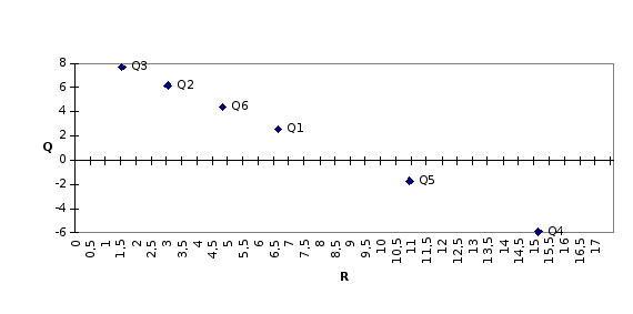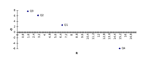 R4 = (15+10+20+22)/4 = 67/4 = 16,75 Минимальный средний ожидаемый риск равен 1.75, что соответствует 3-му решению. При данных вероятностях состояний теперь требуется проанализировать семейство из 4-х операций: каждая операция имеет две характеристики — средний ожидаемый доход и средний ожидаемый риск. Точка (q’, r’) доминирует точку (q, r), если q’q и r’r. Точка, не доминируемая никакой другой, называется оптимальной по Парето. Нанесем для каждой операции эти характеристики на плоскую систему координат для выявления операции, оптимальной по Парето, доход по вертикали и риск по горизонтали.