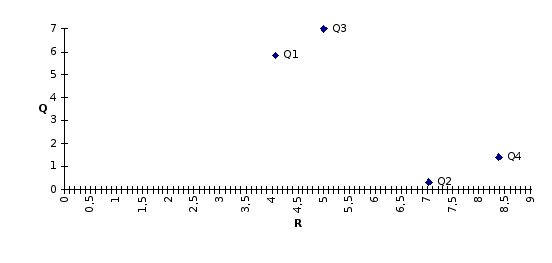 Получили четыре точки. Чем выше точка (q, r), тем более доходная операция, чем точка правее — тем более она рисковая. Значит, нужно выбирать точку левее и выше. Точка (q’, r’) доминирует точку (q, r), если q’q и r’r. В данном примере точка Q3 доминирует точки Q2 и Q4, точка Q1 доминирует точки Q2 и Q4. Точки Q1 и Q3 несравнимы — доходность 3-ей больше, но и риск ее тоже больше. Точка, не доминируемая никакой другой, называется оптимальной по Парето, а множество всех таких точек называется множеством оптимальности по Парето. Легко видеть, что если из рассмотренных операций надо выбрать лучшую, то ее обязательно надо выбирать из операций, оптимальный по Парето. Предположим, что все операции независимы друг от друга, тогда можно выяснить, нет операции, являющейся линейной комбинацией основных операций, более хорошей, чем имеющиеся.