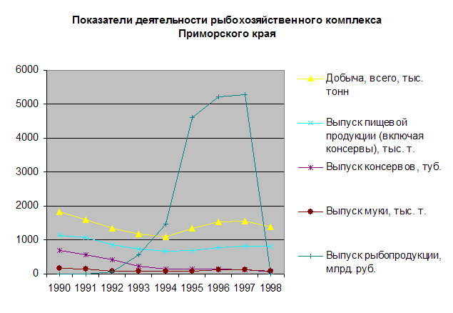 Деятельность Приморской рыбной промышленности в период с 1990 по 1998 гг. характеризовалась следующими показателями (см. табл. 2, рисунок 1) Из таблицы видно уменьшение объема добычи рыбных и нерыбных объектов лова в 1991 – 1994 гг., что связано не только с отсутствием государственной поддержки, но и с общим падением производства в крае и в стране. Начиная с 1995 года объем производства рыбной продукции стал возрастать вплоть до 1997 года, рост составил за это время 45% по добыче, 21% по выпуску пищевой продукции (включая консервы) и 40% по выпуску технической рыбной муки. В 1997 году удельный вес рыбохозяйственного комплекса Приморского края в рыбной промышленности России составил около 38%, а в промышленности края – 30%. Отсюда следует, что рыбохозяйственный комплекс Приморья играет важную роль в обеспечении продовольственной безопасности Российской Федерации (см. рис. 1). Таблица 2 Основные показатели деятельности рыбохозяйственного комплекса Приморья