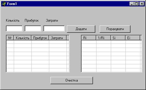 Додаток 13 Програма визначення оптимальних змішаних стратегій діяльності автопідприємства. object Form1: TForm1 Left = 192 Top = 107 Width = 498 Height = 308 Caption = 'Form1' Color = clBtnFace Font.Charset = DEFAULT_CHARSET Font.Color = clWindowText Font.Height = -11 Font.Name = 'MS Sans Serif' Font.Style = [] OldCreateOrder = False PixelsPerInch = 96 TextHeight = 13 object Label1: TLabel Left = 16 Top = 40 Width = 46 Height = 13 Caption = 'Кількість' end object Label2: TLabel Left = 80 Top = 40 Width = 48 Height = 13 Caption = 'Прибуток' end object Label3: TLabel Left = 152 Top = 40 Width = 41 Height = 13 Caption = 'Затрати' end object Edit1: TEdit Left = 16 Top = 64 Width = 57 Height = 21 TabOrder = 0 end object Edit2: TEdit Left = 80 Top = 64 Width = 57 Height = 21 TabOrder = 1 end object Edit3: TEdit Left = 144 Top = 64 Width = 73 Height = 21 TabOrder = 2 end object ListView1: TListView Left = 16 Top = 96 Width = 217 Height = 129 Columns = item Caption = '№' Width = 25 end item Alignment = taCenter Caption = 'Кількість' Width = 60 end item Alignment = taCenter Caption = 'Прибуток' Width = 60 end item Caption = 'Затрати' Width = 60 end> FlatScrollBars = True GridLines = True HotTrack = True TabOrder = 3 ViewStyle = vsReport end object Button1: TButton Left = 224 Top = 64 Width = 97 Height = 25 Caption = 'Додати' TabOrder = 4 OnClick = Button1Click end object ListView2: TListView Left = 272 Top = 96 Width = 209 Height = 129 Columns = item Caption = 'Ri' end item Caption = '1/Ri' end item Caption = 'Si' end item Caption = 'Ei' end> GridLines = True TabOrder = 5 ViewStyle = vsReport end object Button2: TButton Left = 336 Top = 64 Width = 105 Height = 25 Caption = 'Порахувати' TabOrder = 6 OnClick = Button2Click end object Button3: TButton Left = 168 Top = 240 Width = 145 Height = 25 Caption = 'Очистка' TabOrder = 7 OnClick = Button3Click end end unit Unit1; interface uses Windows, Messages, SysUtils, Classes, Graphics, Controls, Forms, Dialogs, StdCtrls, ComCtrls; type TForm1 = class(TForm) Edit1: TEdit; Edit2: TEdit; Edit3: TEdit; Label1: TLabel; Label2: TLabel; Label3: TLabel; ListView1: TListView; Button1: TButton; ListView2: TListView; Button2: TButton; Button3: TButton; procedure Button1Click(Sender: TObject); procedure Button2Click(Sender: TObject); procedure Button3Click(Sender: TObject); private { Private declarations } public { Public declarations } end; var Form1: TForm1; arr:array[1..100] of record cnt,prb,ztr:integer;end; implementation {$R *.DFM} procedure TForm1.Button1Click(Sender: TObject); var q:integer; begin with self.ListView1.Items.Add do begin Caption:=inttostr(Index+1); SubItems.Add(self.Edit1.Text); SubItems.Add(self.Edit2.Text); SubItems.Add(self.Edit3.Text); q:=index+1; end; arr[q].cnt:=strtoint(self.Edit1.Text); arr[q].prb:=strtoint(self.Edit2.Text); arr[q].ztr:=strtoint(self.Edit3.Text); end; procedure TForm1.Button2Click(Sender: TObject); var k:integer; ei,si,ri,e12:real; s:string; begin e12:=0; for k:=1 to self.ListView1.Items.Count do begin ri:=(arr[k].prb+arr[k].ztr)/arr[k].cnt; e12:=e12+1/ri; end; for k:=1 to self.ListView1.Items.Count do begin with self.ListView2.Items.Add do begin ri:=(arr[k].prb+arr[k].ztr)/arr[k].cnt; str(ri:5:2,s); Caption:=s; str(1/ri:5:2,s); SubItems.Add(s); si:=1/(ri*e12); str(si:5:2,s); SubItems.Add(s); ei:=(1-self.ListView1.Items.Count+ri*e12)/ri*e12; str(ei:5:2,s); SubItems.Add(s); end; end; end; procedure TForm1.Button3Click(Sender: TObject); var k:integer; begin for k:=1 to self.ListView1.Items.Count do begin arr[k].cnt:=0; arr[k].prb:=0; arr[k].ztr:=0; end; self.ListView1.Items.Clear; self.ListView2.Items.Clear; end; end.