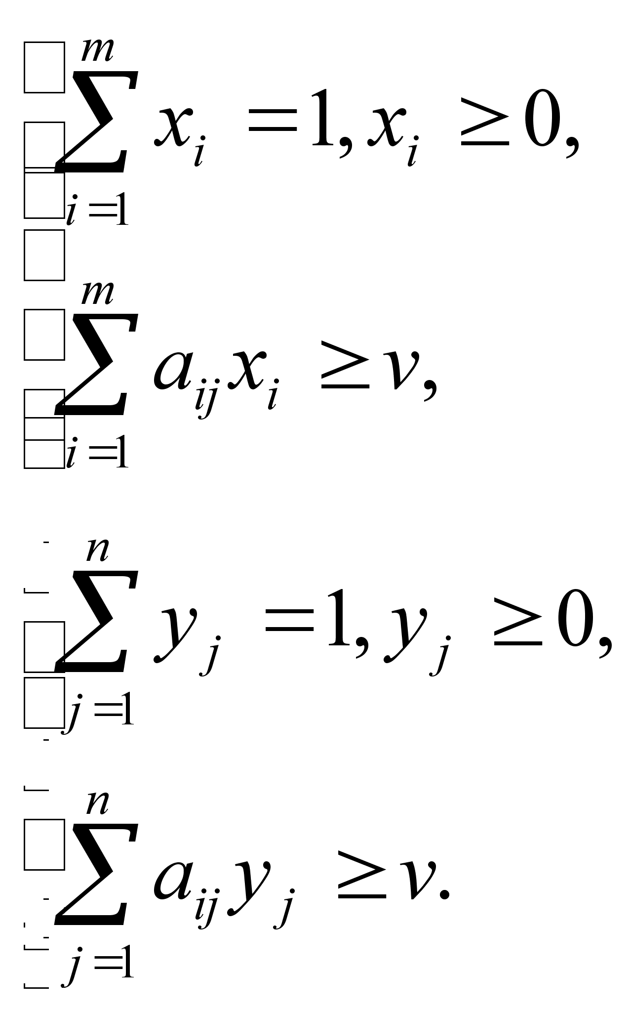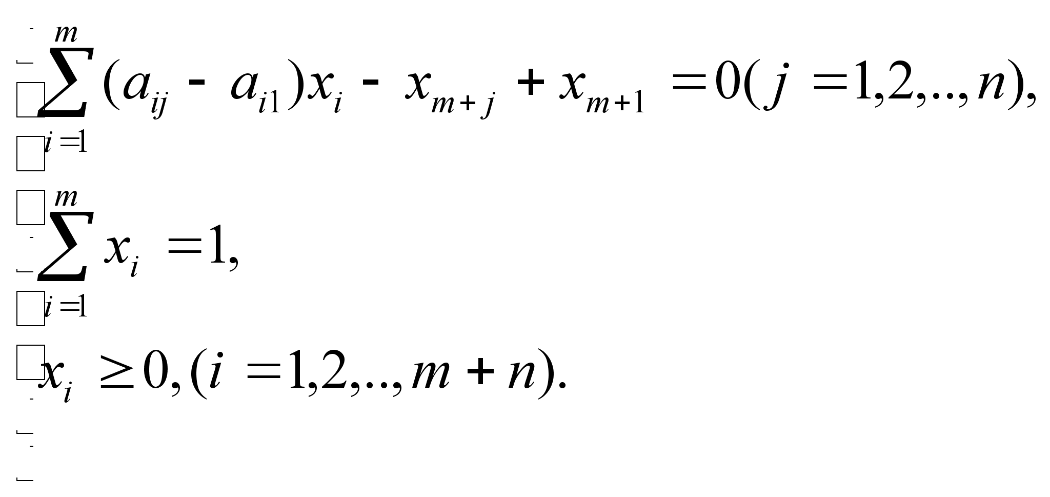 Формули (3.6) та (3.7) виражають двоїсті одна одній задчі лінійного програмування. Для рішення задач існують досить хороші методи, одним з яких є симплекс метод. Розв”язавши ці задачі, отримаємо значення рі і qі та v. Тоді змішані стратегії, тобто значення xi i yi отримаємо за формулами xi=vpi (i=1,2...m), yj=vqj (j=1,2...n) . (3.8) Звичайно це найпростіший метод розв”язання і крім нього є розроблено багато методів, в тому числі і методи, які дозволяють працювати з матрицями, які не відповідають умовам (3.4). Другий метод зведення матричних ігор до задачі лінійного програмування. У цьому випадку ціна гри може бути довільною. Відомо, що оптимальні змішані стратегії x(x1,…,xi,….,xm), y(y1,…,yj,…,yn) і ціна гри з матрицею А=(аij) порядку mxn повинні задовільняти умовам . Ввівши додаткові невід”ємні змінні xm+1 для j-ої нерівності (j=1,2,…n) з (3.3) та для і-ої нерівності (j=1,2,…m) з (3.3) отримуємо наступні рівняння