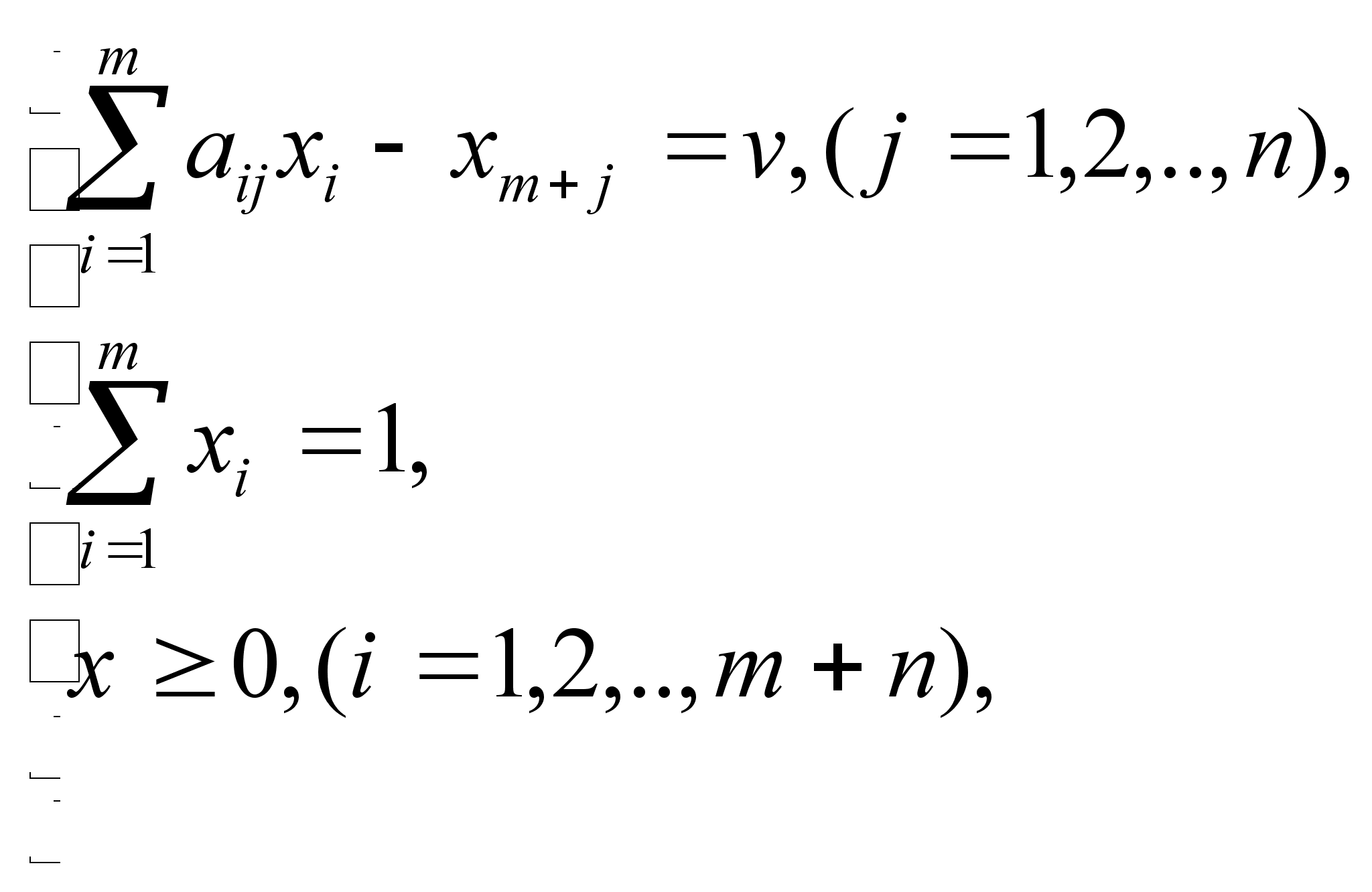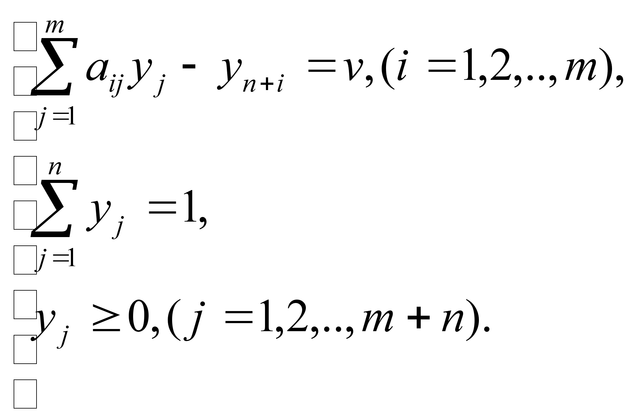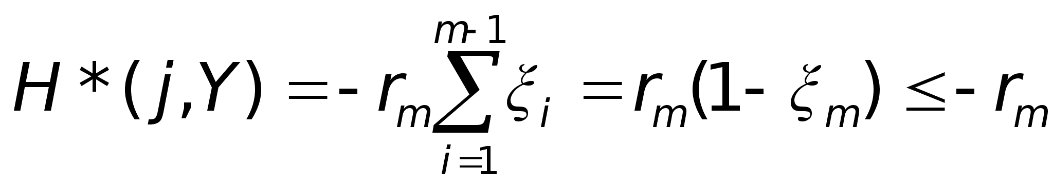 тому v Розглянемо випадок, коли m-на стратегія підприємства є для нього оптимальною. Якщо це так, то значення гри: v= - rm , (4.9) так як Н*(m,1)= - rm. Нехай Y(1, 2,......, n) – оптимальна стратегія ринку. У випадку рівноваги математичне сподівання виграшу Н*(m, Y) підприємства повинно дорівнювати значенню - rm. Отже