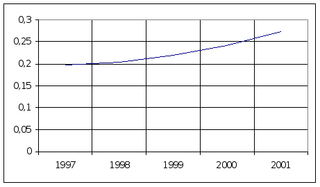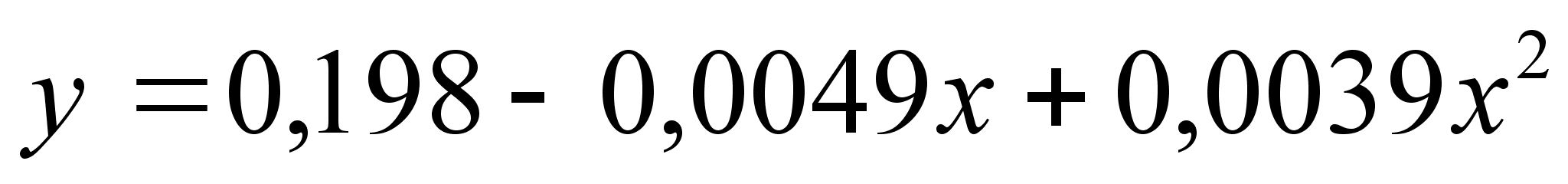 Розв"язавши дану систему рівеняннь матричним методом, отримаємо наступний результат: а0=0,198 , а1=-0,0049 , а3=0,0039 . Знайдені параметри підставляємо у функцію квадратичної параболи, і в результаті отримуємо наступне рівняння для прогнозування оптимальних стратегій діяльності автотранспортного підприємства: