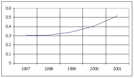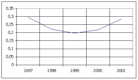 На основі статистичних даних можна отримати досить повне уявлення про економічні, соціальні, екологічні та інші процеси в регіоні, відносні оцінки стану економічних і соціальних процесів в субрегіонах і т.д. У ЛОУС організація збору статистичних даних, їх обробки, зберігання та використання , оновлення та поповнення орієнтуються на сучасні засоби обчислювальнлї техніки та телекомунікації. Тут є досить потужний парк обчислювальної техніки, значний арссенал програмних засобів для обробки інформації. Працює електронна пошта для обміну з Мінстатом та районними відділами, для обслуговування споживачів. Є вихід в систему Internet. Завершується робота над створенням локальної мережі, яка об”єднає всі відділи обласного управління, іде створення автоматизованого інформаційного фонду обласного рівня. 2.Аналіз діяльності автомобільних підприємств 2.1 Аналіз діяльності автомобільного транспорту Львівської області Основні показники діяльності автомобільного транспорту Львівської області приведені в додатку 1. В данному розділі будемо оперувати поняттями - перевезено вантажів, тис.тонн; - перевезено пасажирів, тис.пас; - вантажооборот, тис.ткм.; - пасажирооборот, тис.пас-км.; Перед тим, як проводити оцінку роботи автотранспорта, з”ясуємо зміст деяких показників. Вантажооборот - це показник продукції транспорту в тонно-кілометрах, який визначається сумою добутків ваги окремих вантажних відправленнь в тонах на відстань їх перевезення в кілометрах. Пасажирооборот, по аналогії до попереднього показника, показник продукції автобусного транспорту,який визначається сумою добутків ваги пасажироперевезень в пасажирах на відстань їх перевезення в кілометрах. Для можливості порівняння динаміки розвитку автотранспорту, визначення можливих причин в кількісних та якісних зрушень, загальної ситуації проведемо аналіз показників за 1997 та 1998 роки. Отже, кількість перевезених вантажів зменшилась з 43,6 млн.т до 33,7 млн.т, що складає 22,7 %, аналогічно вантажооборот скоротився на 269,1 млн.т.км (22,16%) з 1213,9 до 944,8 млн.т.км. що свідчить про занепад автомобільного транспорту, що пов”язане як з загальним спадом виробництва, так і з підвищенням цін на енергоносії, що призводить до подорожання автомобільних послуг. Середня відстань перевезень збільшилася на 0,2 км (0,71%) з 27,8 км до 28 км. Кількість перевезених пасажирів також зменшилась на 77,3 млн. (36,58%), з 211,3 до 134 млн.пас за рік, і, відповідно, пасажироборот скоротився на 502 млн.пас.км. (20,08%) з 2499,1 за 1997 рік до 1997,1 за 1998 рік. Середня відстань перевезення пасажира збільшилася з 14,9 до 11,8 км , що складає 3,1 км (26,27%). Це можна пояснити загальним спадом життєвого рівня громадян, а, отже, нестачі коштів на часті переміщення, мандрівки тощо. Також занепад автобусних перевевезень можна пояснити збільшенням кількості власного транспорту ( правда, як видно з подальших показників, кількість легкового транспорту збільшилась лише на 2,1%) Не зважаючи на негативні тенденції в роботі автотранспорту слід зазначити зростання автомобільного парку, зокрема вантажних автомобілів з 37903 до 39127 (3,22%), автобусів з 6404 до 6932 (8,24%), легкових автомобілів з 216515 до 221172 (2,1%). І лишень кількість спеціальних автомобілів зменшилась (з 1125 до 11134, або на 0,81%). Групування автомобільного парку залежно від часу перебування в експлуатації відображено в таблиці 1.3 додатк