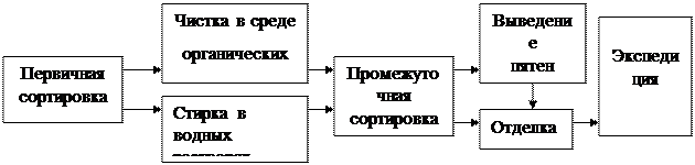 1.2.2 Участок выведения пятен Удаление пятен может производится с помощью пятновыводного станка или вручную. Последовательность удаления пятен. Удаление пятен производится как перед общей мойкой изделий, так и после нее. Предварительное удаление пятен производится в том случае, если пятна в процессе мойки могут закрепится и стать трудноудаляемыми. Закрепление пятен происходит в стадии сушки, когда изделия для освобождения от растворителя обрабатываются воздухом, нагретым до 60-800 С. В этих условиях некоторые вещества начинают диффундировать внутрь волокон, насыщенные кислоты превращаются в высокомолекулярные соединения, многие вещества вступают в химическое взаимодействие с волокнистым материалами. В других случаях удаление пятен необходимо потому, что вещества, образующие пятна, могут вызвать порчу изделий, обрабатываемых совместно. Пятна масляной краски, затвердевшие на изделиях, могут вызвать разрушение тонких шелковых тканей. Перед общей мойкой удаляют с изделий пятна крови, чернил, красителей, губной помады; а также пятна от вина, фруктовых и ягодных соков, травы, ржавчины, туши, пятна от лаков, белковых веществ (молока, мороженого, яиц), растительного масла, рыбьего жира, косметических и лекарственных препаратов. Застаревшие пятна перед мойкой подвергаются размягчению с помощью олеиновой кислоты, растворов ПАВ. При удалении пятен сначала обрабатывают белковые пятна, так как ферменты действуют 30 – 40 мин, затем удаляют легкоудаляемые пятна и под конец оставляют трудноудаляемые. Механизм удаления пятен. Способ удаления пятен зависит от состава загрязнений, образовавших пятно. Возможны растворение, солюбилизация, эмульгирование, диспергирование, химические и биологическое воздействия. Растворение загрязнений происходит при удалении пятен нефтяных масел и жиров при помощи бензина. Солюбилюзирующее действие, или коллоидноя растворимость, имеет место при удалении пятен пота органическими растворителями. В которых соли не растворимы. Эмульгирующее действие на пятна оказывают водные растворы ПАВ, которые окружают частицы жира оболочкой из молекул ПАВ, уменьшают силу сцепления жира с поверхностью волокон и переводят их в эмульсии. Химическое воздействие основано на переводе загрязнений в растворимую форму или бесцветное соединение, не воспринимаемые на ткани как пятно. Биохимическое воздействие имеет место при удалении с помощью ферментов пятен. В состав которых входят белковые вещества. Для определения количества изделий, поступающих на участок выведения пятен, необходимо объём услуг полученный в пункте 1.2.1 из килограммов перевести в штуки. Исходными данными для расчета являются ассортимент обрабатываемых изделий, удельный вес в каждой ассортиментной группы в общем объёме работ, средняя масса конкретного вида ассортимента (табл.1.2.2.1). Таблица 1.2.2.1 Количество изделий в килограммах и штуках в разрезе ассортиментных групп