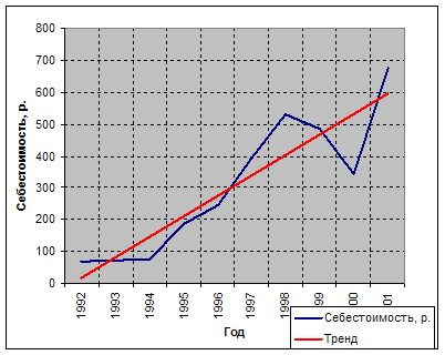 Наблюдается снижение себестоимости, произошедшее в 2000г. по сравнению с 1999г. на 141,91р или 29,31%. Иначе говоря, себестоимость в 2000г. по сравнению с 1999г. составляет 70,69%, т.е. снижение в 0,71 раз. При сравнении с постоянной базой сравнения наибольшее снижение произошло в 1992г, на 238,67р. или на 77,68%. Максимальное повышение себестоимости произошло в 2001г по сравнению с 2000г и составило 334,54р. или на 97,75%, если сравнивать с постоянной базой сравнения, то максимальное повышение произошло в том же 2001г – на 369,54 или на 120,28%. При анализе рядов динамики необходимо учесть тенденцию изменения уровня себестоимости за 1992-2001 гг. Тенденция – это основное направление развития. Основной тенденцией (трендом) называется плавное и устойчивое изменение уровня признака во времени свободное от случайных колебаний. Наиболее эффективным