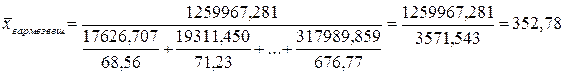 Связь между себестоимостью яйца и рассматриваемыми факторами проявилась сильная, т.е. себестоимость зависит от факторов на 79,65%. 3.3. Средние величины и показатели вариацииСредние величины Средняя величина – это обобщающая характеристика единиц совокупности по определенному признаку. Средняя величина обобщает количественную вариацию признака, т.е. в средних величинах погашаются индивидуальные различия единиц совокупности, обусловленные случайными обстоятельствами. При определении средних величин необходимо придерживаться общих принципов: 1. Исходить из качественного содержания осредненного признака, учитывая взаимосвязь признаков; 2. Нужно учитывать имеющиеся для расчета данные; 3. Средняя величина должна рассматриваться по однородной совокупности; 4. Общие средние величины должны подкрепляться групповыми средними; 5. Необходим обоснованный выбор единицы совокупности, в которой рассчитывается средняя. Для определения средней себестоимости яиц необходимо воспользоваться формулой средней гармонической взвешенной: