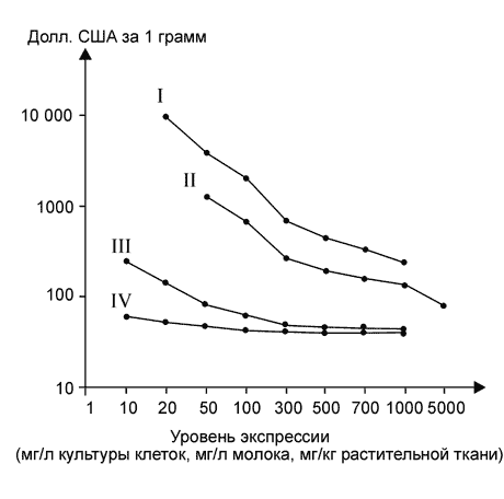 Рис. Динамика цены за 1 грамм рекомбинантного IgA, полученного из разных экспрессирующих систем в зависимости от уровня экспрессии. I - культура клеток млекопитающих; II - молоко трансгенной козы; III - трансгенные растения (семена); IV - трансгенные растения (зелёная биомасса) (По: Daniell et al., 2001). Таблица 2 Антигены, экспрессированные в растениях