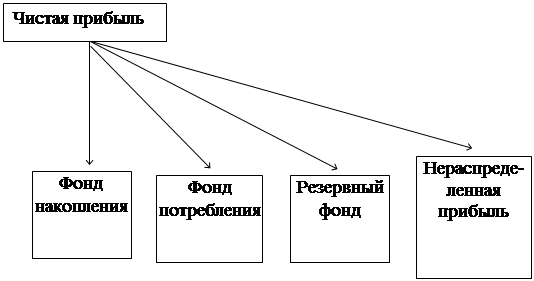 Рис. 1. Распределение прибыли предприятия. В современных условиях хозяйствования государство не устанавливает каких-либо нормативов распределения прибыли, но через порядок предоставления налоговых льгот стимулирует направление прибыли на капитальные вложения производственного и непроизводственного характера, на благотворительные цели, финансирование природоохранных мероприятий, расходов по содержанию объектов и учреждений социальной сферы и т.д. Законодательно ограничивается размер резервного фонда предприятий, регулируется порядок формирования резерва по сомнительным долгам. Распределение чистой прибыли - одно из направлений внутрифирменного планирования, значение которого в условиях рыночной экономики имеет большое значение. Порядок распределения и использования прибыли на предприятии фиксируется в уставе предприятия и определяется положением, которое разрабатывается соответствующими подразделениями экономических служб и утверждается руководящим органом предприятия. В соответствии с уставом предприятия могут составлять сметы расходов, финансируемых из прибыли, либо образовать фонды специального назначения: фонды накопления (фонд развития производства или фонд производственного и научно-технического развития, фонд социального развития) и фонды потребления (фонд материального поощрения), используя Отчет о движении капитала (ф. № 3). Прибыль отчетного периода (или бухгалтерская прибыль), отражаемая по строке 140 в Отчете о прибылях и убытках, корректируется на платежи в бюджет, которые или увеличивают, или уменьшают её в соответствии с Инструкцией ГНИ РФ №37 от 10.08.95г. и внесенных в нее изменений от 25.08.98 г., после чего получается налогооблагаемая прибыль, с которой берется налог на прибыль. Сумма налога на прибыль в форме №2 показывается отдельной строкой 150. Это текущее распределение прибыли отражается в течение на дебете счета 81 "Использование прибыли" субсчет 1 "Платежи в бюджет из прибыли" в корреспонденции с кредитом счета 68 " Расчеты с бюджетом". Для отражения текущего учета использования прибыли организации используется счет 81 «Использование прибыли». Согласно Приказу Минфина РФ №81н от 21.11.97 изменен состав и порядок отражения в учете используемой прибыли на счете 81. С 1 января 1997 года на этом счете отражаются только суммы начисленного налога на прибыль и других платежей в бюджет. Все суммы по операциям, осуществляемых за счет прибыли после налогообложения отражаются на счете 88/1 «Нераспределенная прибыль (непокрытый убыток) отчетного периода» или 88/2 «Нераспределенная прибыль (непокрытый убыток) прошлых лет». Все суммы, скопившиеся на счете 81 нужно сторнировать и отнести на 88/1 «Использование прибыли текущего года». Этот счет является активным. Его дебетовое сальдо показывает сумму использованной в течение года прибыли на обязательные платежи и собственные нужды. В расходы за счет прибыли, остающейся в распоряжении предприятия, включаются: различные выплаты социального направления и другие расходы на поощрение персонала организации Организация может для улучшения контроля за использованием средств на все указанные цели и в соответствии с учредительными документами создавать специальные фонды (фонды накопления и потребления). Это называется фондовым методом реформации баланса. В соответ