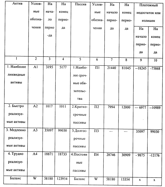 На начало отчетного периода коэффициент автономии составил 0.49 и был близок к нормальному значению (0.5). За анализируемый период значительно увеличилась зависимость фирмы «Орикс» от заемных источников средств (коэффициент автономии снизился на 0.27). Таким образом, лишь около половины обязательств предприятия могут быть покрыты его собственными средствами. Об усилении зависимости предприятия от привлеченного капитала свидетельствует и увеличение коэффициента соотношения заемных и собственных средств. Эта зависимость увеличилась более чем в 3 раза и составила на конец периода 3.40. Этот коэффициент означает, что на каждый рубль собственных средств приходится 3.4 рубля заемных средств. Таким образом предприятие имеет очень низкую финансовую устойчивость. Динамика коэффициента маневренности свидетельствует о том, что доля собственного капитала, вложенного в оборотные средства, снизилась с 32% в начале отчетного периода до 28% в конце отчетного периода. Коэффициент обеспеченности запасов и затрат собственными источниками формирования составил в фирме «Орикс» на начало 1995 года 0.27, а на конец — 0.08, т.е. снизился на 0.19. Это означает, что на каждый рубль средств, вложенных в запасы и затраты, стало приходиться на 19 коп. меньше собственных средств. На конец отчетного периода их приходится всего 8 коп. на один рубль вложенных средств. Следовательно, на предприятии ощущается существенный недостаток собственных источников формирования запасов и затрат, что делает финансовое положение предприятия крайне неустойчивым. 1.3.3. Анализ ликвидности балансаЛиквидность баланса определяется как степень покрытия обязательств предприятия его активами, срок превращения которых в деньги соответствует сроку погашения обязательств. Анализ ликвидности баланса заключается в сравнении средств по активу, сгруппированных по степени их ликвидности и расположенных в порядке убывания ликвидности, с обязательствами по пассиву, сгруппированными по срокам их погашения и расположенными в порядке возрастания сроков. При этом под ликвидностью активов следует понимать быстроту превращения данного вида активов в деньги. Чем меньше времени необходимо для того, чтобы данный вид активов превратился в деньги, тем выше его ликвидность. Таблица 1.3.3.1. Абсолютные показатели ликвидности баланса фирмы «Орикс» за 1996 год ед. изм. - тыс. руб.