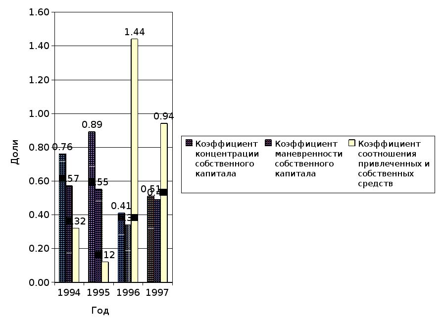 где КПР – расчетный коэффициент покрытия; КПУ – установленный коэффициент покрытия. Экономический смысл приведенных показателей следующий : - коэффициент покрытия характеризует общую обеспеченность предприятия оборотными средствами для ведения хозяйственной деятельности и современного погашения срочных обязательств предприятия; - коэффициент обеспеченности собственными оборотными средствами характеризует долю собственных оборотных средств в общей их сумме; - коэффициент восстановления (утраты) показывает наличие реальной возможности у предприятия восстановить либо утратить свою платежеспособность в течении определенного периода. Расчет коэффициентов показан в таблице 3.17. Приведенные данные в таблице 3.17 показывают, что коэффициенты текущей ликвидности вписываются в нормативное значение. В 1994 году на момент установления платежеспособности он равен – 4 > 2, в 1995 году – 5,4 > 2, в 1996 году коэффициент меньше норматива – 1,2 < 2 и это говорит о плохом положении на предприятии, в 1997 году коэффициент повысился – 1,5 < 2, но не достиг нормативного значения это говорит о том, что положение улучшается но в целом нужно признать структуру баланса неудовлетворительной, а предприятие не платежеспособным. Коэффициент обеспеченности собственными оборотными средствами за все 4 года вписывается в нормативное значение, в 1994 году – 0,6 > 0,1, в 1995 году – 0,8 > 0,1, в 1996 году – 0,2 > 0,1, в 1997 году – 0,3 > 0,1. В 1994 году коэффициент восстановления (утраты) платежеспособности вписывается в нормативное значение, 1,4 > 1, в 1995 году – 2,2 > 1. Это говорит о благоприятной тенденции. В 1996 году коэффициент снижается – 0,6 < 1, в 1997 году увеличивается, но не достигает норматива – 0,75 < 1. Скачкообразные показатели говорят о том, что на предприятие нестабильность и следует принять меры по укреплению своей платежеспособности.