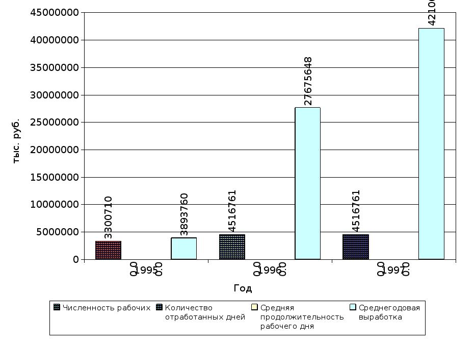 где Кпр - расчетный коэффициент покрытия; Кпу - установленный коэффициент покрытия. Экономический смысл приведенных показателей следующий : - коэффициент покрытия характеризует общую обеспеченность предприятия оборотными средствами для ведения хозяйственной деятельности и современного погашения срочных обязательств предприятия; - коэффициент обеспеченности собственными оборотными средствами характеризует долю собственных оборотных средств в общей их сумме; - коэффициент восстановления (утраты) показывает наличие реальной возможности у предприятия восстановить либо утратить свою платежеспособность в течении определенного периода. Расчет коэффициентов показан в таблице 3.17. 4 Анализ хозяйственной деятельности ТОО "Дорстройсервис" 4.1 Объем производственной программы Объем выполнения СМР во многом определяется трудовыми показателями. В частности численностью персонала, факторным анализом. При анализе производственной программы очень важно установить потери в результате несоблюдения нормативных сроков строительства, распыления материально - технических и трудовых ресурсов. Выполнение производственной программы зависит также от обеспеченности рабочей силой и от квалификационных работ и колебаний выработки. На выполнение производственной программы значительное влияние оказывают : своевременная обеспеченность объектов строительства и ремонта проектно - сметной документацией, материально - техническими ресурсами, рабочего времени. Анализ указанных факторов дает возможность определить степень влияния трудовых факторов на выполнение производственной программы. На основании статистического отчета, рассчитаем среднегодовую и среднечасовую выработку, полученные результаты приведены в таблице 4.1. Среднегодовая выработка (Сг) на одного работника рассчитывается по формуле: Сг=О\Чср, где О - объем строительно-монтажных работ, тыс. руб.; Чср - среднесписочная численность рабочих (работников), человек. Среднедневная выработка (Сд) на одного работника рассчитывается по формуле: Сд=О\К, где О - объем строительно-монтажных работ, тыс. руб.; К - общее количество отработанных рабочих человеко-дней. Среднечасовая выработка (Сч) на одного работника рассчитывается по формуле : Сч=О\Кч, где О - объем строительно-монтажных работ, тыс. руб.; К ч - количество отработанных всеми работниками человеко-часов. Количество часов работы одного работника (Кр) в течении года рассчитывается по формуле: Кр=К\Чср, где К - общее количество отработанных рабочими человеко-часов; Чср - среднесписочная численность рабочих, человек. Приведенные данные в таблице 4.1 показывают, что возросла численность работников по сравнению с 1994 годом, в 1995 году - 371%, в1996 году - 471%, в 1997 году численность работников к 1994 году составила 471% и не изменилась по отношению к 1996 году. Возросла среднечасовая выработка на одного работника по сравнению с 1994 годом, в 1995 году на 186%, в 1996 году на 582%, в 1997 году на 834% по сравнению с 1994 годом. Это говорит о благоприятной тенденции для предприятия. Среднегодовая выработка на одного работника увеличивалась и составляла в 1995 году – 187% по отношению к 1994 году, в 1996 году – 585% к показателю к 1994 года, в 1997 году - 837% к 1994 году. На рисунке 4.1 показано динамика численности, среднегодовой выработки, на одного работника. Факторный анализ на объем СМР Использ