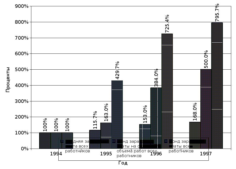 | Фонд заработной платы на один рубль объема работ всех работников | 100% | 163.0% | 384.0% | 500.0% |