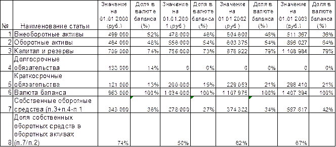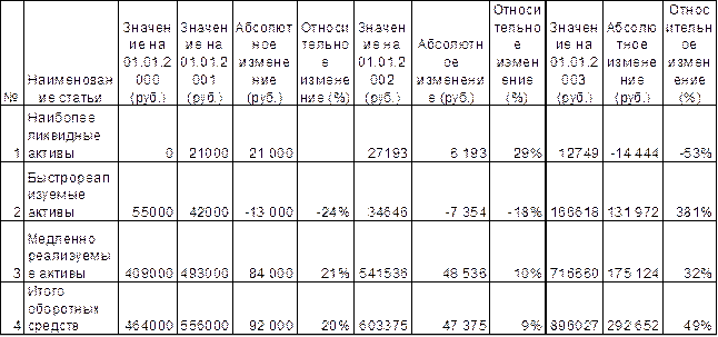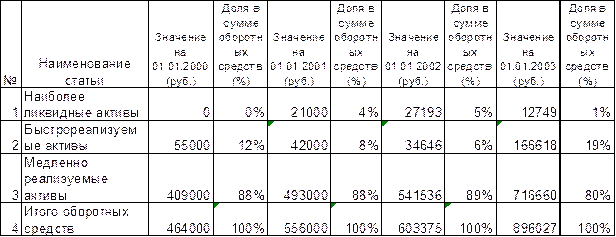 На начало анализируемого периода (01.01.2000 г.) предприятие не обладало наиболее ликвидными активами. Доля быстрореализуемых активов была равна 12% общей суммы оборотных средств. Медленно реализуемые активы составляли 88% оборотных средств. За 2000 год произошли следующие изменения. Доля наиболее ликвидных активов на 01.01.2001 г. возросла до 4% оборотных средств. Хотя, принимая во внимание то, что на предыдущую отчетную дату их вообще не было, можно сказать, что у предприятия появились наиболее ликвидные активы, составляющие 4% оборотных средств. Доля быстрореализуемых активов сократилась на 4% до 8%. Это произошло за счет сокращения быстрореализуемых активов на 24% от их суммы на 01.01.2000 г.. Видимо, наиболее ликвидные активы (денежные средства) появились в следствие сокращения быстрореализуемых активов (погашения дебиторской задолженности), которое сформировало наиболее ликвидные активы на 62% (13 000 руб. / 21 000 руб. х 100%). Доля медленно реализуемых активов осталась постоянной – 88% из-за, практически, равного темпа роста с общей суммой оборотных средств. В общей сумме оборотные средства выросли на 20% (92 000 руб.). Большую часть этого увеличения составил рост медленно реализуемых активов – 84 000 руб. или 91% прироста (84000 руб. / 92 000 руб. х 100%), и рост наиболее ликвидных активов на 21 000 руб., перекрывший уменьшение быстрореализуемых активов. В целом можно сделать вывод, что в 2000 году оборотные средства, а с ними и все предприятие, стали более ликвидными, т.к. доля медленно реализуемых активов осталась прежней, а часть быстрореализуемых активов перешли в более ликвидную категорию. За 2001 год (на 01.01.2002 г.) доля наиболее ликвидных активов повысилась до 5% оборотных средств. Это произошло из-за опережающего роста наиболее ликвидных активов (29%) по сравнению с общим ростом оборотных средств (9%). Доля быстрореализуемых активов уменьшилась еще на 2% - до 6% . Причиной снижения стало уменьшение суммы быстрореализуемых активов на 18% (7 354 руб.) и рост общей величины оборотных средств. Доля медленно реализуемых активов возросла на 1% - до 89%, в следствие немного более быстрого их роста по сравнению со всеми оборотными средствами (10% роста против 9%). В целом можно сделать вывод о незначительном снижении в 2001 году ликвидности оборотных средств из-за уменьшения быстрореализуемых активов , нивелировавшего рост наиболее ликвидных активов, а также из-за достаточно динамичного роста медленно реализуемых активов. Анализируя темпы роста, можно говорить о замедлении тенденций прошлого (2000-го) года. Так, продолжился рост наиболее ликвидных активов, но в меньшей степени : увеличение на 6 193 руб. в 2001 году против 21 000 руб. в 2000 году; продолжилось падение быстрореализуемых активов – на 18%, что все же меньше 24%-ного падения 2000 года; также , как и в 2000 году увеличились медленно реализуемые активы, но на 10% по сравнению с 21% роста в 2000 г. . В итоге, оборотные средства также увеличились, но на 9% по сравнению с 20% роста 2000 года. В 2002 году (на 01.01.2003 г.) доля наиболее ликвидных активов сократилась на 4% - до 1% оборотных средств. Это произошло из-за 53% снижения данного вида активов и 49% роста общей величины оборотных средств. Доля быстрореализуемых активов увеличилась в 3,2 раза – до 19%. Быстрореализуеме активы совершили настоящий «рывок», увеличившись в 4,8 раза (прирост 381%). Медленно реализуемые активы выросли на 32%. Общая с