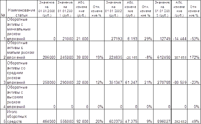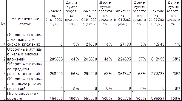 Таблица 8 Динамика оборотных средств, распределенных по степени риска вложений