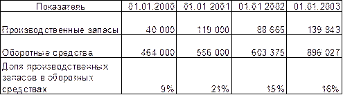 Проведя общий анализ структуры и динамики оборотных средств, перейдем к более подробному анализу их составляющих. Первыми в цепочке кругооборота текущих активов стоят производственные запасы (но после денежных средств, которые являются как бы связующим звеном циклов кругооборота). В целом, их доля в оборотных средствах невелика : Таблица 9 Доля производственных запасов в оборотных средствах (руб.)