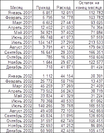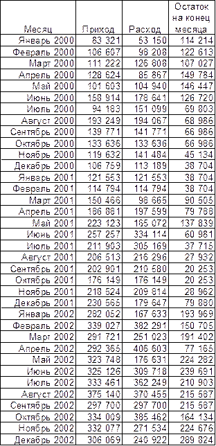 ½ Мянв.01 + Мфев.01+ … + Мнояб.02 + ½ Мдек.02 Мср = 23 месяца В расчете участвуют 23 месяца, а не 24 месяца потому, что январь 2001 года выпадает, как не имеющий остатка на начало месяца (вернее, из-за недостатка информации). Взять общий остаток производственных запасов на начало 2001 года из баланса было бы неправильно из-за несопоставимости данных (основные материалы являются частью производственных запасов). Мср = 2 294 664 / 23 = 99 768 руб. Теперь мы можем рассчитать размах вариации по формуле : (Mmax – Mmin) / 2 v = Мср v = ( 213 533 – 13 437 ) / 2 / 99 768 х 100% = 100,2% Мы получили очень большое число. Это означает, что поставки материалов крайне неритмичны и средний остаток материалов за двухлетний период не несет какого-нибудь серьезного экономического смысла. Велик размах вариации и по годам : Мср2001 = 123 621 руб. Мmax = 213 533 руб. Mmin = 71 884 руб. v2001 = (213 533 - 71 884) /2 / 123 621 х 100% = 57% Мср2002 = 77 903 руб. Мmax = 165 559 руб. Mmin = 13 437 руб. v2002 = (165 559 - 13 437) / 2 / 77 903 х 100% = 98% Выясним причины столь больших колебаний остатков материалов на складе. Построим график поставок и расхода материалов и совместим его с графиком остатка материалов (Рис.4). На данном рисунке мы видим, что скачок запасов материалов на 01.08.2001 г. (31.07.2001 г.) явился следствием скачка оприходованных материалов в июле 2001 г. . Закупки материалов в 4 раза превысили их расход в этом месяце. Запас же на конец месяца обеспечил бы производство той же интенсивности на 6 месяцев. Рассчитаем среднемесячный расход (РМср) материалов в 2001 году. Расчет по формуле простой средней величины : РМср2001 = ∑РМ / 12 = 349 570 / 12 = 29 131 руб. Рассчитаем длительность обеспечения производства сделанными в июле 2001 года закупками : 154 147 / 29 131 = 5,3 месяца Рост же запасов начался на месяц раньше – в июне 2001 года. В этот месяц (июнь) приход материалов на 63% превысил расход материалов. В общем за два месяца было приобретено материалов на 7,6 месяцев работы: (66 748 + 154 147) / 29 131 = 7,6 Запас на конец июля обеспечивал предприятие также на 7 месяцев работы : 213 533 / 29 131 = 7,3 Надо сказать, что период июнь-август 2001 года были месяцами наибольшего потребления. Но даже если взять реальный, а не среднемесячный расход за месяцы, начиная с июня 2001 года включительно, то мы увидим, что закупленного количества хватило бы на 6,5 месяцев. То есть, такой рост закупок не оправдан даже из соображений сезонности. Рис. 4 Динамика поставок, расхода и остатка материалов на складе в 2001 году. В 2002 году наблюдается подобная картина (Рис. 5). Рис. 5 Динамика поставок, расхода и остатка материалов на складе в 2002 году. Также, как и в 2001 году, скачок запасов материалов на 01.08.2002 г. (31.07.2002 г.) явился следствием скачка оприходованных материалов в июле 2002 г. . Закупки в 4 раза превышают расход за месяц : 140 265 / 35 768 = 3,9 Сделанный запас превышает расход за июль 2002 г. в 4,6 раза : 165 559 / 35 768 = 4,6 Рассчитаем среднемесячный расход (РМср) материалов в 2002 году. РМср2002 = ∑РМ / 12 = 576 465 / 12 = 48 039 руб. Рассчитаем срок, на который предприятие обеспечили оприходованные в июле 2002 года материалы : 140 265 / 48 039 = 3 месяца Рост запасов, как и в предыдущем году, начался в июне. В этот месяц (июнь) приход материалов на 63% превысил расход материалов. В общем за два месяца было приобретено материалов на 4,4 месяца: (70 368 + 140 265) / 48 039 = 4,4 Длительность образованного запаса для обеспечения среднегодового уровня производства равна 3,4 месяца: 165 559 / 48 039 = 3,4 С учетом реального помесячного расхода запаса хватило бы на 3 меся