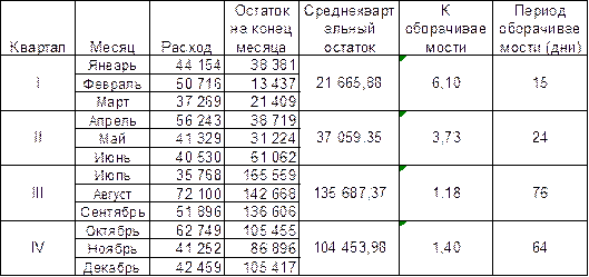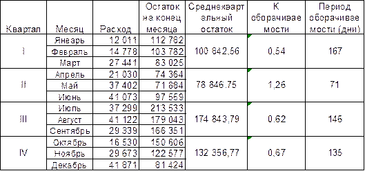 Из показателей таблицы 11 можно сделать вывод о медленной оборачиваемости производственных запасов. При этом периоды особенно продолжительного одного оборота приходятся на кварталы со значительными запасами на складе. Оживление наблюдается только во втором квартале при снижении среднеквартального остатка материалов по сравнению с первым кварталом на 22%, а с третьим и четвертыми кварталами – в 2,2 раза и в 1,7 раза соответственно. Проведем подобные расчеты оборачиваемости для 2002 года. В таблице 12 мы можем наблюдать еще более жесткую зависимость оборачиваемости от средней величины запасов. Таблица 12 Расчет коэффициента оборачиваемости и периода оборачиваемости запасов в 2002 году.
