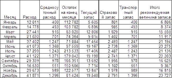 Прямым убытком от замораживания средств являются повышенные складские расходы и излишне начисленный налог на имущество. Косвенным убытком является недополученная прибыль. К сожалению, мы не можем выделить складские расходы из общей себестоимости. Рассчитаем потери от излишне начисленного налога на имущество. Для этого вычислим среднехронологическую величину сверхнормативного запаса по датам составления отчетов по налогу. ½ 105 976 + 67 475 + 74 284 + 149 726 + ½ 57 697 Зсв.норм.ср = 4 Зсв.норм.ср = 93 330 руб. Излишне начисленный налог на имущество = 93 330 х 1% = 933 руб. . Недополученная прибыль при ставке по банковским депозитам юридических лиц 16% равна : 93 330 х 16% = 14 933 руб. Рассчитаем рекомендуемый запас материалов на складе в 2002 году (таблица 15). Таблица 15 Расчет рекомендуемого запаса материалов на складе для 2002 года