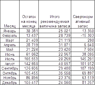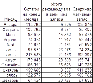 В таблице 15 мы видим, что во всех месяцах, за исключением периода февраль-апрель 2002 года, фактические запасы намного превышают рекомендуемые. Как и для 2001 года, вычислим объем сверхнормативных запасов. Таблица 16 Расчет сверхнормативных запасов в 2002 году