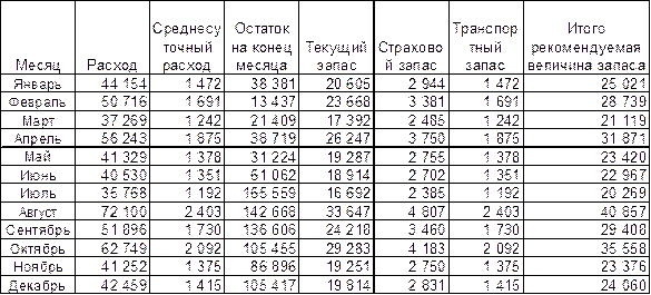 С ростом остатка на складе оборачиваемость резко замедляется. Таким образом, на основании анализа динамики прихода, расхода и остатков материалов на складе, а также на основании анализа оборачиваемости запасов можно сделать вывод о неритмичности поставок материалов, создании излишних запасов, что ведет к замедлению оборачиваемости материалов, замораживанию средств и снижению эффективности деятельности предприятия. Проведем расчет рекомендуемой величины запасов на складе. Общая величина запасов на складе состоит из текущего запаса, страхового, технологического, сезонного и транспортного. Рассчитаем размер текущего запаса по формуле : Зт = РМсут х И, где Рмсут – среднесуточный расход материалов, И – интервал поставки, время между двумя поставками. С целью экономии транспортных расходов целесообразно загружать одну или несколько грузовых машин целиком. Расположение поставщиков в г. Астрахани дает возможность осуществления частых рейсов с минимальным количеством автомобилей за 1 рейс. Примем интервал поставки в 2 недели (14 дней). Затем вычислим страховой запас материалов по формуле : Зс = РМсут х (Вотгр + Втр + Впр + Впод), где Рмсут – среднесуточный расход материалов, Вотгр – время на отгрузку материала поставщиком, Втр – время транспортировки, Впр – время на приемку материала, Впод – время на подготовку материала к производству. Так как отгрузка, транспортировка и приемка материалов осуществляется в один день, то Вотгр + Втр + Впр = 1 день. По этой же причине предусмотрим транспортный запас также на 1 день. Подготовка материалов к производству (Впод) занимает один день. Предприятие имеет возможность оперативно регулировать поставку материалов круглый год, а наша цель – рассчитать обоснованную величину производственных запасов и избежать затаривания. Поэтому сезонный запас мы не предусматриваем. Итак, длительность текущего запаса равна 14 дней, страхового – 2 дня, время транспортировки – 1 день, сезонный запас отсутствует. Рассчитаем рекомендуемый запас материалов на складе в 2001 году (таблица 13). Таблица 13 Расчет рекомендуемого запаса материалов на складе для 2001 года
