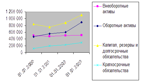 Анализируя таблицу 1 в активах можно увидеть тенденцию постепенного сокращения доли внеоборотных активов и увеличение доли оборотных средств. Если на начало 2000 года они были примерно равны (52% и 48%), то в конце 2002 года оборотные активы явно превалируют – всего 36% внеоборотных против 64% оборотных активов. Эти изменения произошли за счет более быстрого постоянного роста оборотных средств – на 93% (896027/464000 * 100% - 100%) за три года по сравнению с 2% ростом ( 511367/499000*100%-100%) внеоборотных активов за тот же период. Из приведенных выше наблюдений можно сделать два вывода : 1) в следствие снижении доли внеоборотных активов повысилась мобильность средств, предприятие получило возможность более гибко управлять своими активами; 2) повысилась роль оборотных средств, от количества и структуры которых благополучие предприятия зависит теперь в большей степени. Мы также можем проследить стратегию предприятия по финансированию оборотных средств. Для этого сравним внеоборотные активы с одной стороны и капитал с долгосрочными обязательствами с другой стороны, либо оборотные активы с одной стороны и краткосрочные обязательства с другой стороны. Их разность представляет собой собственные оборотные средства предприятия. На всем протяжении исследуемого периода они имеют положительное значение – т.е. предприятие обладает таковыми, и их величина постоянно растет. За три года работы увеличение собственных оборотных средств составило 74%. Таким образом можно сделать вывод о том, что предприятие выбрало (либо имеет возможность проводить) компромиссную стратегию финансирования оборотных средств. Данную стратегию можно графически отобразить следующим образом :