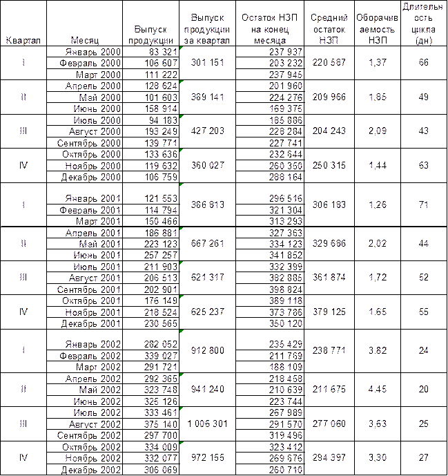 Для трехлетнего периода это небольшое значение (минимальный размах вариации производственных запасов только за один год был равен 57%). В целом наблюдается постепенное стабильное увеличение среднехронологического остатка незавершенного производства: НЗПср2000 = 117 466 руб. ; НЗПср2001 = 182 955 руб. ; НЗПср2002 = 294 805 руб. Проанализируем, как это отражается на оборачиваемости незавершенного производства и на длительности производственного цикла, который, фактически, является временем изготовления изделия. Таблица 18 Динамика оборачиваемости незавершенного производства и длительности производственного цикла