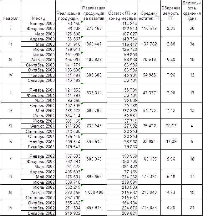 В данной таблице мы видим сильно изменяющийся остаток готовой продукции на складе. В 2000 году ясно прослеживается тенденция увеличения остатков готовой продукции до мая месяца, а затем их постепенного снижения к концу года. Из этого можно сделать вывод о необоснованно завышенных запасах готовой продукции на начало года, которые поддерживались и даже возрастали в течение пяти месяцев. Резкими скачками отмечен 2001 год. Величина запаса на конец марта 2001 года возросла в 2,3 раза. Причина – 50-типроцентное превышение производства продукции над сбытом. И это при том, что в течение двух предыдущих месяцев производство равнялось сбыту. В марте же производство было увеличено на 31,6% по сравнению с февралем, а сбыт упал на 14%. Подобная ситуация наблюдается в мае этого же года. Остаток готовой продукции на конец мая вырос по сравнению с концом апреля на 72,8%. Производство превысило сбыт на 35%. Произведено продукции было на 19,4% больше, чем в прошлом месяце, а продано продукции на 16,5% меньше чем в прошлом месяце. Похожие ситуации разнонаправленного изменения производства продукции и ее реализации наблюдаются в июне 2001 года, январе, апреле, мае, ноябре 2002 года . Рассчитаем оборачиваемость готовой продукции и ее среднюю продолжительность хранения на складе : Таблица 20 Динамика оборачиваемости готовой продукции и средней продолжительности хранения на складе