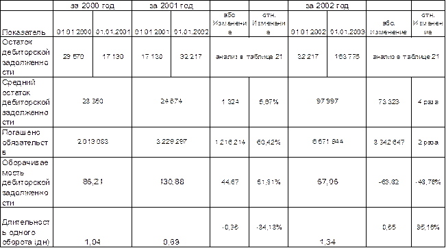 За 2000 год дебиторская задолженность уменьшилась на 12 440 руб. или 42%. Это произошло из-за превышения погашения задолженности над объемом реализации на эту же величину. В 2001 году мы наблюдаем увеличение задолженности на 15 087 руб., что составляет 88% остатка на предыдущую отчетную дату. Рост задолженности был обусловлен более быстрым увеличением реализации по сравнению с ростом платежей от покупателей (62% против 60%). К концу 2002 года резко вырос остаток задолженности – в 5 раз, а ткже объем реализации за год и объем исполнения дебиторами своих обязательств – в 2 раза. В целом можно сделать вывод о хорошо поставленной работе по взысканию задолженности с покупателей : остаток дебиторской задолженности не превышает 2% годового объема реализации (максимальное значение зафиксировано 01.01.2003 г.). Рассчитаем оборачиваемость дебиторской задолженности : Таблица 22 Динамика оборачиваемости дебиторской задолженности