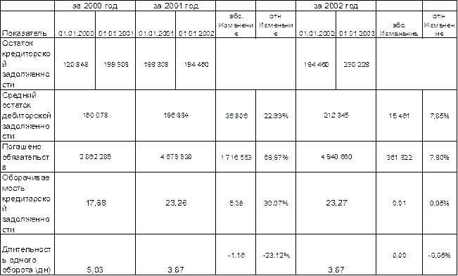 В таблице мы видим очень высокую оборачиваемость дебиторской задолженности : в 2000 году за квартал дебиторская задолженность успела обернуться 86 полных раз, в 2001 году – в 1,5 раза (на 52%) больше. В 2002 году оборачиваемость снизилась и стала даже ниже уровня 2000 года, оставаясь, тем не менее, на высоком уровне – 67 оборотов в квартал. Фактически, длительность одного оборота немного превышает один день. Это означает, что предприятие отпускает продукцию по предварительной оплате и только узкому кругу постоянных клиентов предприятие предоставляет короткий коммерческий кредит. Кроме показателей финансовой устойчивости и рентабельности для предприятия очень важно сбалансировать денежные потоки. Иначе даже при прибыльной работе может сложиться ситуация недостаточности денежных средств для расчетов с кредиторами, что повлечет взыскание по судебным искам, дополнительные расходы, уничтожение наработанной деловой репутации и даже банкротство предприятия. Но прежде чем приступить к анализу движения денежных средств хотелось бы рассмотреть основные факторы их движения. Один из основных факторов поступления денежных средств – дебиторскую задолженность, мы рассмотрели. Теперь рассмотрим фактор расходования денежных средств – кредиторскую задолженность и их совокупное влияние. Таблица 23 Динамика оборачиваемости кредиторской задолженности