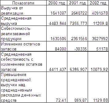 В данной таблице изменения все показатели имеют знаки (+ или -) в зависимости от их влияния на остаток денежных средств и чистый денежный поток. Мы видим, что в 2000 году предприятие преимущественно наращивало запасы и незавершенное производство, что приводило к снижению чистого денежного потока. Однако его величина все же имела положительное значение в 21 865 руб. Главными источниками средств являлся рост кредиторской задолженности, покрывший отток из-за наращения запасов, и прибыль предприятия – увеличение собственных средств. В 2001 году предприятие продолжало наращивать запасы, но теперь уже запасы незавершенного производства и готовой продукции. В этом году это отвлекло средств на 30 356 руб. меньше, чем в предыдущем. Дополнительные денежные средства дало уменьшение запасов материалов, рост кредиторской задолженности, но главным источником накоплений стала полученная прибыль предприятия. В результате чистый положительный денежный поток составил 5 328 руб. В 2002 году предприятие резко нарастило дебиторскую задолженность, остатки готовой продукции и производственные запасы, что повысило денежные расходы на 387 655 руб. . Здесь предприятие не спасли ни 230 062 руб. увеличения собственных средств, ни уменьшение НЗП на 89 410 руб., ни рост долга перед кредиторами на 69 357 руб. . Чистый денежный поток стал отрицательным - 14 444 руб., что привело к уменьшению остатка денежных средств до 12 749 руб. . В целом по проведенному исследованию оборотных средств предприятия можно сделать следующие выводы. Предприятие работает с прибылью, расширяет свою деятельность, нарашивает основные и оборотные средства. В этом процессе поддерживается структура оборотных средств, обеспечивающая приемлемую ликвидность и степень риска. Однако, в 2002 году снизилась эффективность управления себестоимостью, в частности контроль за нематериальными затратами, доля которых в себестоимости продукции увеличилась и не дала снизиться всей себестоимости вслед за удельными материальными затратами. В итоге рост себестоимости почти что догнал рост выручки от реализации. Кроме этого, на предприятии очень не эффективно ведется управление запасами материалов и готовой продукции на складе. Склад, практически, постоянно затарен, поставки материалов и отгрузка продукции ведется нерегулярно, скачками. Скорее всего, на предприятии слабо поставлена система исследования рынка, планирование продаж и закупок. Для обеспечения запасом готовой продукции производство, видимо, работает в перегруженном режиме. В моменты крупных поставок или отгрузки продукции, вероятно, нередки авралы, приводящие к порче материалов и продукции. Излишние запасы замораживают средства и ведут к прямым и косвенным убыткам. Ликвидация излишних запасов материалов и готовой продукции, а с ними и лишних остатков НЗП, высвободит средства для финансирования расширения производства и перехода на идеальную стратегию финансирования оборотных средств.