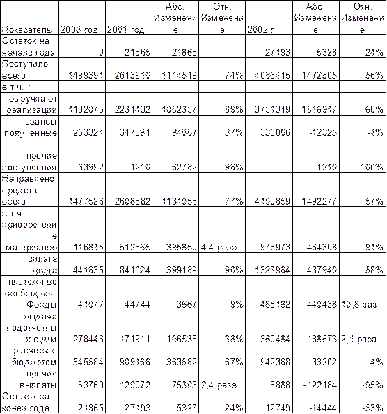 В результате превышения поступлений денежных средств над расходом на 21 865 руб. (1,5% расходов) были созданы денежные средства в таком же размере. В 2001 году рост поступлений отставал от роста платежей на 3% (74% против 77%). Однако, небольшое превышение поступлений над платежами все же сохранилось, что привело к увеличению остатка денежных средств на 5 328 руб. или 24%. Основной составляющей поступлений является выручка от реализации – 79% в 2000 году и 85% в 2001 году. Ее доля растет из-за более высокого темпа роста по сравнению с общими поступлениями (89% против 74%). Общие поступления отстают из-за медленного роста полученных авансов и падения прочих поступлений. Структура расхода более равномерна, особенно если учесть, что большая часть подотчетных сумм тратится на приобретение материалов. Показательно, что с резким увеличением закупок материалов (в 4,4 раза) , на 38% снизилась выдача подотчетных сумм. В 2002 году опережающий темп роста расходов сделал свое дело : общая сумма расходов превысила поступления на 14 444 руб. (на 1% расхода). Соответственно, на эту же сумму уменьшился и остаток денежных средств на конец 2003 года. По проведенному анализу можно сделать вывод о примерном равенстве положительных и отрицательных денежных потоках. Это наталкивает на не слишком удовлетворительную оценку деятельности, если бы не факт наличия сверхнормативных запасов материалов, подтверждаемый постоянным значительным ростом раходов на приобретение материалов (2001 г. – 4,4 раза, 2002 г. – 91%). Проведем косвенный анализ движения денежных средств в зависимости от назначения платежей и расходов. Таблица 26 Анализ движения денежных средств косвенным методом