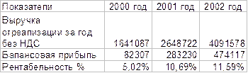 В таблице 2 мы видим динамичный рост отдачи основных средств предприятия. Кроме этого, рост был постоянен (без спадов) на протяжении всех трех лет. Поэтому, мы с уверенностью может взять для расчетов значение фондоотдачи последнего года – 8 руб. 5 коп реализованной продукции на 1 руб. основных средств. Здесь необходимо подчеркнуть одно допущение. Расчет фондоотдачи производится исходя из объема произведенной продукции в натуральных или стоимостных измерителях. В нашем расчете участвует объем реализованной продукции, который обычно отличается от объема произведенной продукции. Но доля реализованной продукции, изменения остатков на складе ГП являются характеристикой службы маркетинга предприятия, эффективность которой в нашем исследовании предполагается постоянной. Поэтому замена произведенной продукции на реализованную на конечный результат не повлияла. Далее, определим рост выручки от покупки оборудования на дополнительные 597 617 руб. : 597 617 х 8,05 = 4 810 817 руб. . Следующим шагом рассчитаем рентабельность реализованной продукции, исходя из балансовой прибыли (Таблица 3). Таблица 3 Расчет рентабельности реализованной продукции