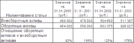Мы видим, что уровень рентабельности также постоянно растет. Поэтому для расчета примем значение рентабельности 2002 года – 11,59%. Здесь мы также принимаем допущение о постоянстве уровня внереализационных и операционных доходов и расходов. Таким образом, приобретение основных средств и увеличение выпуска продукции увеличило бы балансовую прибыль на : 4 810 817 руб. х 11,59 % = 557 574 руб. , а чистую прибыль на : 557 574 – (557 574 х 24%) = 423 756 руб. . Однако, это не окончательное значение прироста прибыли, как могло бы казаться на первый взгляд. Дело в том, что привлекаемые ресурсы – платные. Ставка по кредитам сроком на 1 год сейчас равна около 20% годовых. Выплата процентов уменьшит экономический эффект от покупки и эксплуатации дополнительных основных средств. Кроме этого, важно учесть необходимость увеличения оборотных средств для загрузки дополнительного оборудования. Рассчитаем соотношение оборотных и основных средств предприятия. Таблица 4 Динамика основных и оборотных средств предприятия