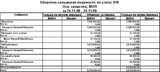 3.2.2. Контроль корректности ввода входящей информации После ввода входящих сальдо по всем бухгалтерским счетам на вспомогательном счете «00» или «000» не должно быть остатка. Кроме того проконтролировть правильность введенной информации можно и при помощи любой из форм отчетности, входящей в состав программы, например пользуясь оборотно-сальдовой ведомости по счету: