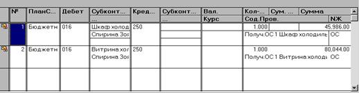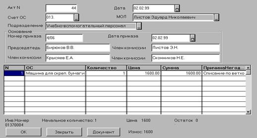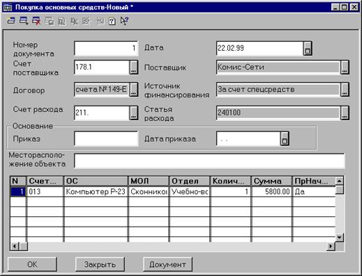 Номер документа присваивается автоматически. Дата документа. В качестве даты высвечивается текущая дата. При необходимости ее можно изменить. Дата документа будет записана в реквизиты субконто как дата поступления основного средства в организацию. Счет Поставщика. Выбирается из плана счетов счет расчетов с поставщиками. По умолчанию предлагается счет 178.1. Поставщик. Необходимо выбрать из справочника «Контрагенты» организацию-поставщика основных средств. Договор. Из справочника «Основания», подчиненного справочнику «Контрагенты», выбирается договор (счет, счет-фактура), на основании которого проводилась оплата основного средства. Источник финансирования. Указывается, за счет каких средств приобретено основное средство. Выбирается из списка значении перечисления «Движениефонда». Счет расхода Из списка счетов необходимо выбрать счет, на кото рый будут относиться затраты на приобретение основных средств По умолчанию предлагается счет 200.1. Статья расхода. Если по выбранному в предыдущем реквизите счету ведется аналитический учет по статьям расходов в соответствии с «Экономической классификацией расходов», из списка субконго выбирается нужная статья расхода. Если по выбранному счету ведется аналитический учет по другим статьям, выбирается соответствующая сгатья. Если аналитический учет не ведется переходим к следующей позиции, нажав клавишу Enter. Приказ. Вводится номер распоряжения/приказа. Дата приказа. Вводится дата распоряжения/приказа. Месторасположение объекта. Вводится местонахождение объекта в момент приемки основного средства. Затем необходимо заполнить строки табличной части документа. Номер строки. Заполняется автоматически. Счет ОС. Из плана счетов выбирается счет, на котором будет учитываться конкретное основное средство. Основное средство. Из справочника «Основные средства» выбирается конкретное основное средство, если список заведен заранее, или в этот список добавляется новое основное средство и затем выбирается нужное. Структура и реквизиты справочника «Основные средства» были рассмотрены ранее. Заполнив необходимые реквизиты, следует нажать кнопку «ОК» для сохранения их в карточке и нажатием клавиши Enter (или двойным нажатием правой клавиши мыши) внесите основное средство в документ. МОЛ Подтверждаются данные, указанные в карточке основного средства, нажатием клавиши Enter. Отдел. Подтверждаются данные, указанные в карточке основного средства, нажатием клавиши Enter. Количество. Проставляется требуемое количество. Если по данному виду основных средств не ведется групповой учет, то количество равно 1. Сумма. Вводится стоимость основного средства по документам приобретения, включая НДС. Стоимость основных средств, приобретенных за счет средств от реализации продукции, работ услуг, должна указываться без НДС. Сумма указывается в рублях и копейках. При групповом учете вводится стоимость указанного количества основного средства. Признак начисления износа - выбирается одно из значений: «Да» если по объекту определяется износ; «Нет» - если по объекту не определяется износ (предметы для на учных и учебных целей, музейные ценности и т.п ). Код нормы износа выбирается из справочника «Нормы износа», содержащего шифры и нормы износа для различных групп основных средств в соответствии с документом «