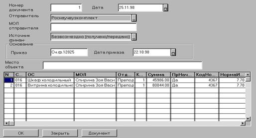 Отправитель Из списка организаций (справочник «Контрагенты») выбирается организация, из которой передаются основные средства МОЛ отправителя Вводится Ф.И.О отправителя Источник финансирования. Указывается за счет каких средств приобретено основное средство. По умолчанию установлено значение «Безвозмездное получение» из списка перечисления «Движениефонда» При проведении документа по каждому основному средству автоматически будут сформированы следующие проводки: если передается новое основное средство (без износа) - на сумму балансовой стоимости (Дт выбранного субсчета счета 01, Кр250); если передается основное средство, бывшее в эксплуатации, оно должно приходоваться по остаточной стоимости. В соответствии с действующими Указаниями № АБ-23-Д от 280674 г «При поступлении основных средств (фондов) инвентарных объектов, бывших в эксплуатации, от других организаций принимающая сторона отражает в бухгалтерском учете по дебету счета 01 «Основные средства» их балансовую стоимость без вычета износа и по кредиту счетов 250 «Фонд в основных средствах» их балансовую стоимость за вычетом износа и 020 «Износ основных средств» - сумму износа этих объектов на основании документов передающей организации». В этом случае формируются 2 проводки на сумму начисленного износа (Дт выбранного субсчета счета 01, Кр020) и на сумму балансовой стоимости за вычетом износа (Дт выбранного субсчета счета 01, Кр250); если передается полностью изношенное ОС, проводка формируется на сумму балансовой стоимости (Дт выбранного субсчета счета 01, Кр020)