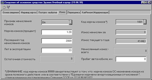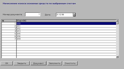 Для заполнения спецификации можно использовать кнопку «Заполнить». По нажатию этой кнопки спецификация документа будет заполнена номерами счетов, по которым ведется учет основных средств. Кнопкой «Очистить» можно отменить заполнение спецификации. Собственно расчет необходимых сумм и формирование проводок по каждому основному средству, учитываемому на выбранных счетах, выполняется документом в момент проведения. Документ в дальнейшем может перепроводиться, при этом ранее сформированные документом проводки удаляются и формируются новые- Кроме того, при проведении документа в карточке ОС заполняются реквизиты группы «Износ». Перед проведением документа рекомендуется сформировать печатный документ «Ведомость начисленного износа основных средств» (Приложение 4). В него попадают все основные средства, у которых признак начисления износа установлен «Да». В случае, если для какого-либо ОС признак начисления износа установлен «Да», но не задана норма износа, выдается предупредительное сообщение.