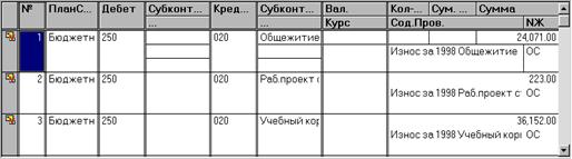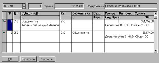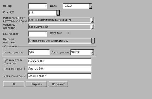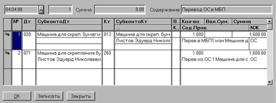 Счет МБП. Из плана счетов выбирается счет, на котором будут учитываться МБП. МБП. Из списка субконто «МБП» выбирается конкретный МБП (если он заранее внесен в этот список) или его надо добавить в этот список и затем выбрать. После заполнения последней графы таблицы на экран вновь будет выдан список основных средств для очередного выбора. Таким образом заполняются строки табличной части документа. После заполнения всех реквизитов документ можно записать в журнал операций. При проведении документа будут сформированы проводки по списанию основных средств, отобранных в спецификацию: Дт250, Кр счета ОС - списывается остаточная стоимость ОС; Дт020, Кр счета ОС - списывается начисленный износ и по оприходованию МБП: Дт счета МБП, Кр260.