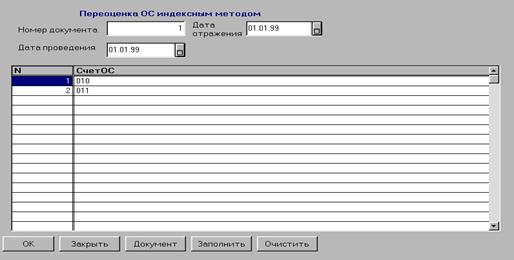 Дата документа. В качестве даты документа следует записать дату проведения переоценки, т.е. дату, «по состоянию на» которую будет производиться переоценка. Следует отметить, что, как правило, пере оценка проводится «задним числом», поэтому дата документа может значительно отличаться от текущей даты, и для просмотра уже записанного и проведенного документа, возможно, придется изменить интервал видимости журнала. Затем необходимо заполнить спецификацию - последовательно выбрать из списка основные средства, которые необходимо переоценить, и задать для каждого коэффициент переоценки. Перед проведением документа рекомендуем проверить правильность задания коэффициентов. Для этого можно сформировать по кнопке «Документ» протокол ввода и распечатать его при обнаружении ошибок их следует исправить. При проведении документа коэффициенты переоценки будут записаны в карточки основных средств, отобранных в спецификацию. Коэффициент переоценки является периодическим реквизитом основного средства и, следовательно, записывается на определенную дату. При проведении документа коэффициенты переоценки, заданные в нем, будут записаны в реквизиты карточки основного средства на дату документа. При отмене проведения документа или его удалении значения, записанные в карточку документом, будут удалены. Документ «Переоценка индексным методом» Документ «Переоценка индексным методом» предназначен для расчета полной восстановительной стоимости основных фондов путем индексации балансовой стоимости отдельных объектов с применением индексов изменения стоимости основных фондов, дифференцированных по типам зданий и сооружений, видам машин и оборудования, транспортных средств и других основных фондов по регионам, периодам изготовления, приобретения (далее индексный метод) и автоматического формирования проводок на суммы дооценки балансовой стоимости и дооценки износа по основным средствам, подлежащим переоценке. Для каждого основного средства, подлежащего переоценке, предварительно должен быть задан коэффициент переоценки - коэффициент пересчета балансовой стоимости основного средства в восстановительную стоимость Для основных средств, не подлежащих переоценке, не нужно указывать коэффициент переоценки. Такие основные средства не будут участвовать в расчете.