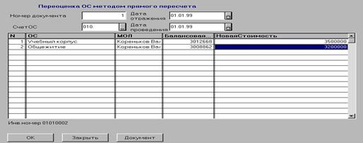 Новая стоимость. Вводится восстановительная стоимость ОС по документально подтвержденным рыночным ценам на них, сложившимся на дату проведения переоценки. При переоценке основных средств путем прямого пересчета по каждому ОС в первую очередь вычисляется коэффициент переоценки путем деления новой стоимости на балансовую, а затем числящаяся в бухгалтерском учете по состоянию на дату проведения переоценки сумма износа основных средств (включая объекты, по которым полностью начислен износ) умножается на соответствующий коэффициент. Превышение суммы износа, исчисленной в соответствии с вышеуказанным алгоритмом, над суммой начисленного износа по основным средствам, отобранным в спецификацию, отражается по дебету субсчета 250 «Фонд в основных средствах» и кредиту субсчета 020 «Износ основных средств». Перед проведением документа рекомендуется сформировать печатный документ «Ведомость начисления переоценки основных средств». С его помощью можно проверить правильность начисления переоценки. В случае, если для какого-либо ОС переоценка за заданный период уже была проведена, например, другим документом, выдается предупредительное сообщение.