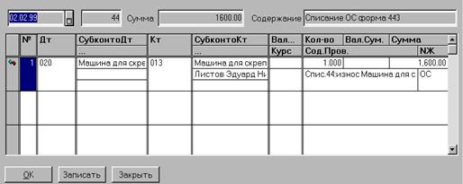 После заполнения всех реквизитов документа можно сформировать и распечатать для всех основных средств, отобранных в спецификацию, «Акт на списание с баланса белья, постельных принадлежностей, инструментов, производственного и хозяйственного инвентаря», форма № 443 (Приложение 7). При проведении документа формируются проводки по списанию ОС, отобранных в спецификацию: q по полностью изношенным ОС - Дт020, Кр счета ОС (списывается начисленный износ); q по недоамортизированным ОС - Дт250, Кр счета ОС (списывается остаточная стоимость ОС и Дт020, Кр счета ОС (списывается начисленный износ).