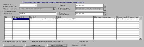 Нажатием на кнопку «Документ» можно сразу же получить твердую копию документа «Акт-накладная» приемки-передачи основных средств (Приложение 3). Документ «Безвозмездное получение ОС» Документ «Безвозмездное получение» предназначен для оформле ния поступления безвозмездно полученных основных средств «Актом приемки основных средств (форма № ОС-1)» и формирования соответствующих проводок.