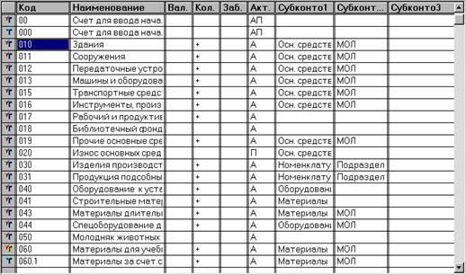 3.1.2. Настройка плана счетов и аналитического учета В соответствии с инструкцией № 122 от 03 11.93 г. учет основных средств в бюджетных учреждениях ведется в разрезе инвентарных объектов по местам хранения и ответственным лицам. В типовой конфигурации синтетический учет основных средств ведется на счетах: 010 «Здания», 011 «Сооружения», 012 «Передаточные устройства», 013 «Машины и оборудование», 015 «Транспортные средства», 016 «Инструменты, производственный (включая принадлежности) и хозяйственный инвентарь», 017 «Рабочий и продуктивный скот», 018 «Библиотечный фонд», 019 «Прочие основные средства». Кроме того, за балансом учитывается имущество, принятое в аренду, но учитываемое у арендодателя (счет А01 «Арендованные основные средства»). Все счета по отношению к балансу являются активными. Остатки основных средств и их приход записываются по дебету счета, а выбытие по кредиту. Аналитический учет на балансовых счетах ведется в разрезе инвентарных объектов (субконто 1 вида «Основные средства» типа справочник «Основные средства») и материально-ответственных лиц (субконто 2 вида «МОЛ» типа справочник «МОЛ») в количественном и стоимостном измерителях. Аналитический учет на забалансовом счете А01 «Арендованные основные средства» ведется в разрезе инвентарных объектов (субконто 1 вида «Основные средства»), материально-ответственных лиц (субконто 2 вида «МОЛ») и арендодателей (субконто 3 вида «Контрагенты» типа справочник «Контрагенты») в количественном и стоимостном измерителях.