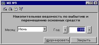 Произведя настройку диалога и нажав кнопку «Сформировать» получаем отчет – Оборотно –сальдовую ведомость по счету 010 (Приложение 8). В группу специализированных отчетов входят следующие формы: q Инвентарная карточка ОС q Опись инвентарных карточек q Оборотная ведомость ОС q Оборотная ведомость ОС по МОЛ q Ведомость основных средств q Ведомость ОС по МОЛ q Ведомость ОС по счету q Ведомость начисленного износа q Ведомость износа по счету q Ведомость начисленной переоценки Кроме перечисленных отчетов, можно сформировать отчеты «Инвентаризационная опись ОС» и «Сличительная ведомость ОС» из группы отчетов «Инвентаризация» и «Мемориальный ордер 9» из группы отчетов «Мемориальные ордера», а также стандартные отчеты. Вот как, например, выглядит настройка отчета «Мемориальный ордер № 9»: